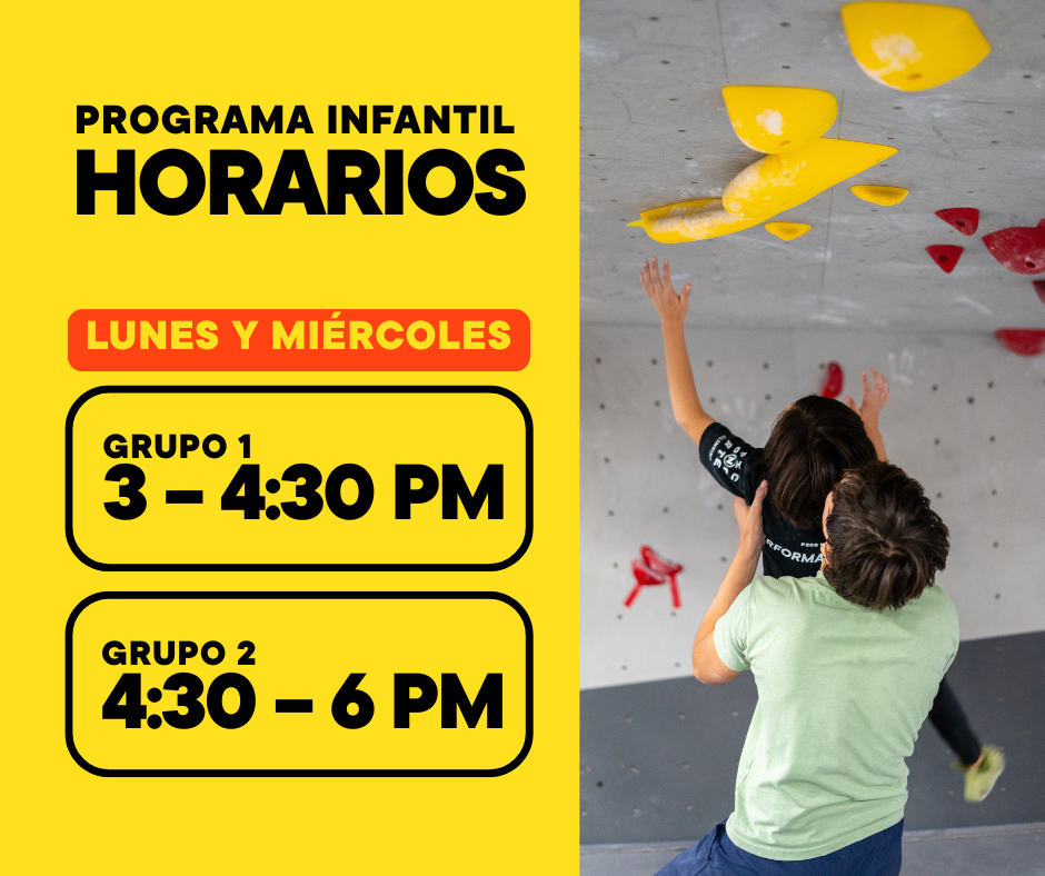 Una clase ideal para que niñas y niños vivan su primera experiencia en la escalada. Incluye: zapatos de renta, magnesia y asesoría grupal con un coach.