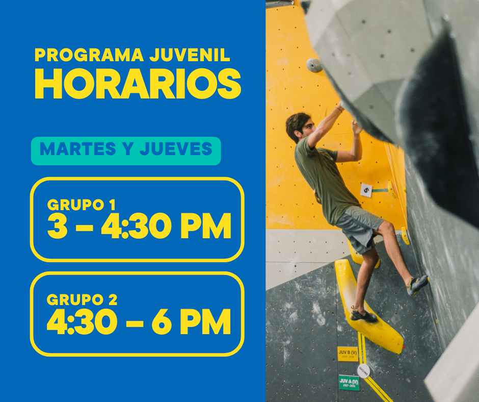 De 13 a 19 años. Este grupo es ideal para jóvenes que quieren escalar, moverse y conectar con su cuerpo y su comunidad. Promovemos la autosuperación, la disciplina y el disfrute, acompañándolos en su desarrollo físico y emocional mientras se divierten escalando. A partir de 12 a 16 años.